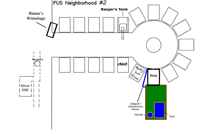 Just open in your favorite image editing program, draw to your heart's content, and then post it here. All I ask is that you keep the file format .png. When saved as .jpg, especially when using MSPaint as undoubtedly many of you participating will, it adds compression as makes the picture look crappy. Other than that, do whatever. You can increase the size of the map, add your own plots of land, draw in whatever you please. Hell, we could start a whole little FUS city with grocery marts and hair salons and adult video shops and everything! This first map is just to serve as a guide. You're perfectly welcome to draw in houses that take up more than one plot of land. Just don't ruin peoples' property... without their permission.