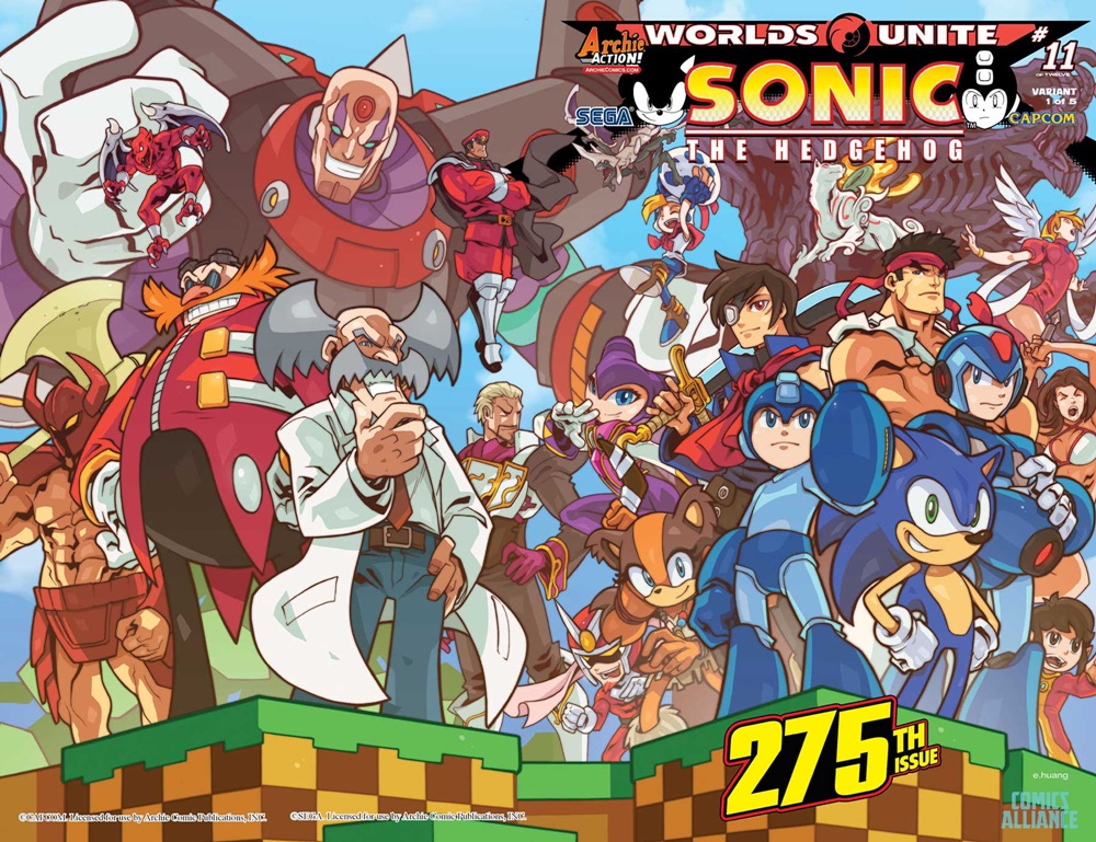 CELEBRATE 275 ISSUES OF SONIC THE HEDGEHOG with his good buddy Mega Man and the worlds of STREET FIGHTER, BILLY HATCHER, NiGHTS INTO DREAMS, MONSTER HUNTER and more in this DOUBLE-SIZED ISSUE! “Worlds Unite” Part Eleven: It’s pan-dimensional pandemonium as the unified army begins their attack on Sigma! Sonic, Mega Man and X lead an all-star roster of heroes from across the SEGA and Capcom universes in an all-out assault against the villainous robot from the future! Will they be enough to save all their worlds, or has Sigma already become a god? Featuring a wrap-around cover from the legendary Patrick “SPAZ” Spaziante! PLUS 5 variant covers from Edwin Huang, Lamar Wells, Tracy Yardley, Rafa Knight and part 11 of the epic 12-part connecting variant cover series by artist Ben Bates! Don’t miss the penultimate chapter to the biggest crossover event in Archie Action history!Script: Ian Flynn